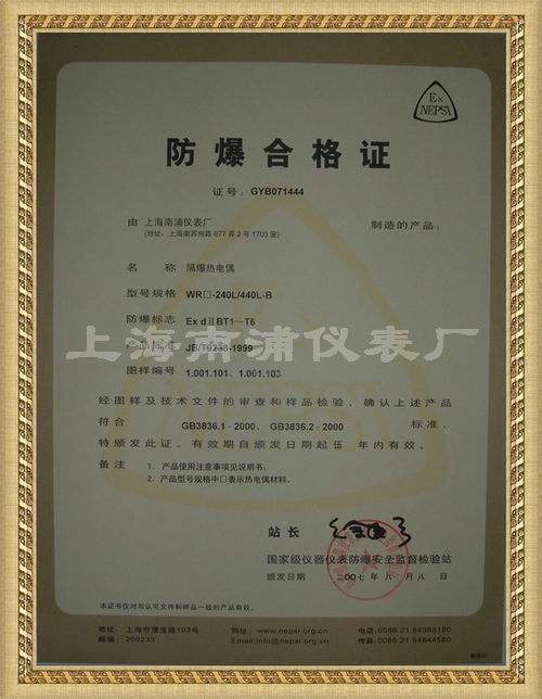 > 热电偶防爆合格证